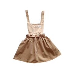 This sand color pinafore is our special design. Bella pinafore sand has the skirt which joins to the bib by resin buttons which can be undone, and the skirt can be worn on its own. The paper bag skirt has two large pockets at the hips. There is another large pocket at bib. We use topstitching as a decorative finish on our products. This style of pinafore comes in 4 more colors, each one is beautiful. You have a choice of neutral sand or gold, as well as classic girl’s pink. Moreover, there are denim blue and an olive-green option.