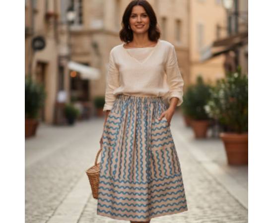 Organic Cotton Gathered Skirt – Waves is a beautifully draped gathered style skirt. It is designed for comfort and style. Handmade from soft organic cotton twill. It features a wide elastic at the waist for an easy, flexible fit. The print placement adds a unique artistic touch. The upper section of the skirt is cut so that wavy lines flow vertically, while the bottom section showcases the print horizontally for a playful contrast. At the same time the vertical lines give more slimming effect. Finished with two roomy patch pockets. The skirt is perfect for everyday wear.